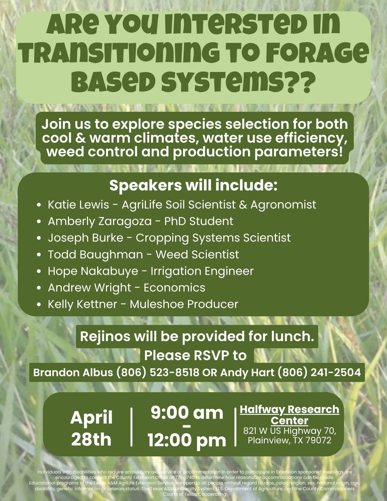 Join us April 28 (9 AM–12 PM) at Halfway Research Center in Plainview, TX for practical insights on species selection, water efficiency, weed control, and production.